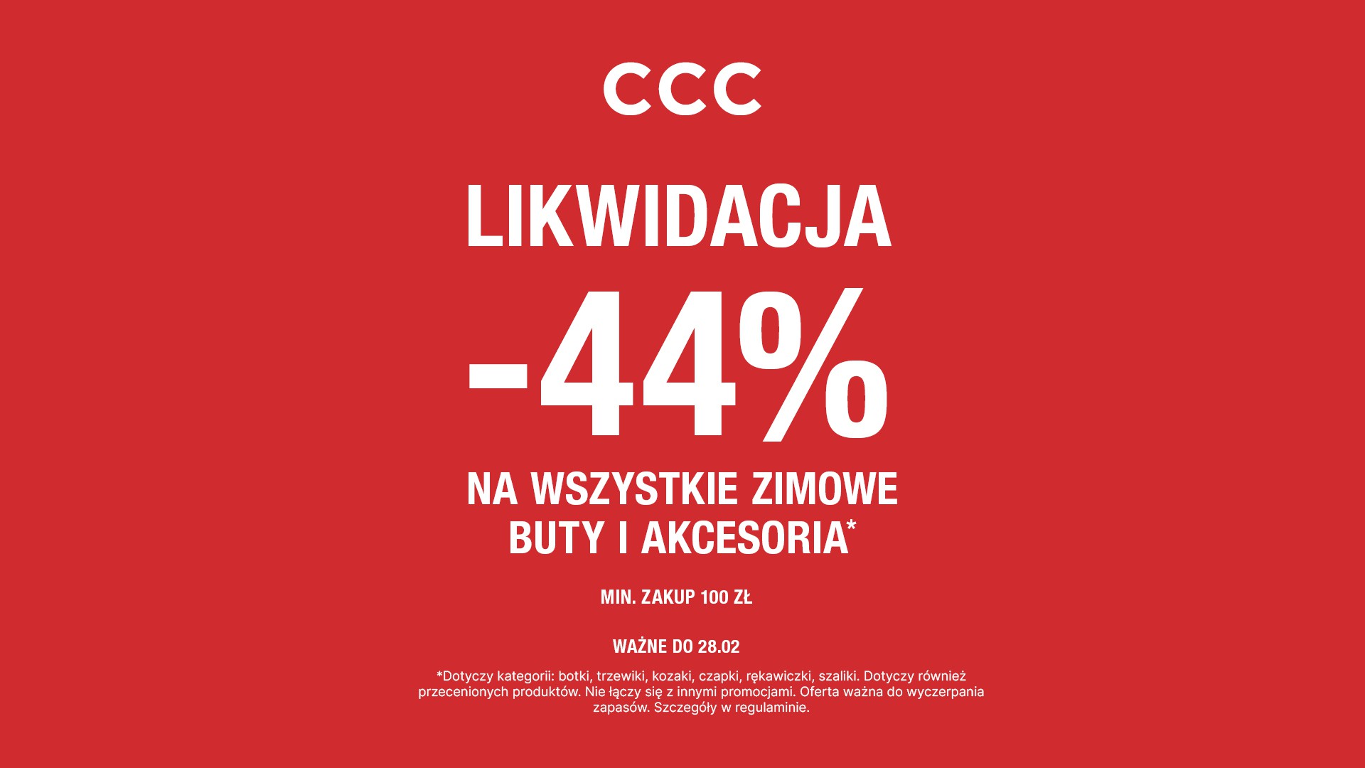 Likwidacja zimowej kolekcji w CCC! -44% na wszystkie botki, kozaki, trzewiki i akcesoria - także już przecenione! Zrób zakupy za minimum 100 zł i zyskaj rabat 44% na zimowe buty i akcesoria. Oferta ważna do 28 lutego lub do wyczerpania zapasów. Szczegóły w regulaminie.