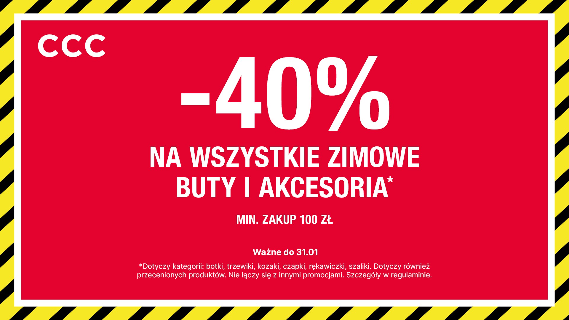 Mega okazja! W CCC aż -40% na całą kolekcję zimową! Botki, kozaki, trzewiki i akcesoria — nawet przecenione. Rabat aż 40% przy zakupach za min 100 zł. Tylko w salonach CCC. Szczegóły w regulaminie