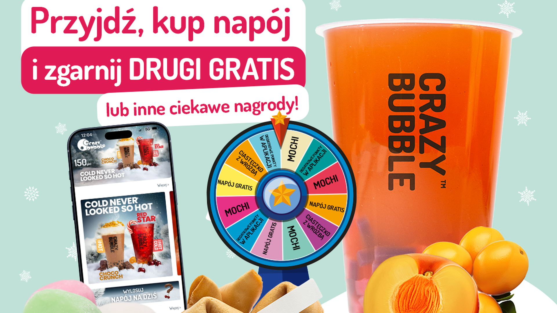 Akcja obowiązuje podczas ferii zimowych 2026, a możliwość zakręcenia kołem daje zeskanowanie aplikacji Crazy Bubble, oraz obserwacja Naszego profilu na Instagramie.