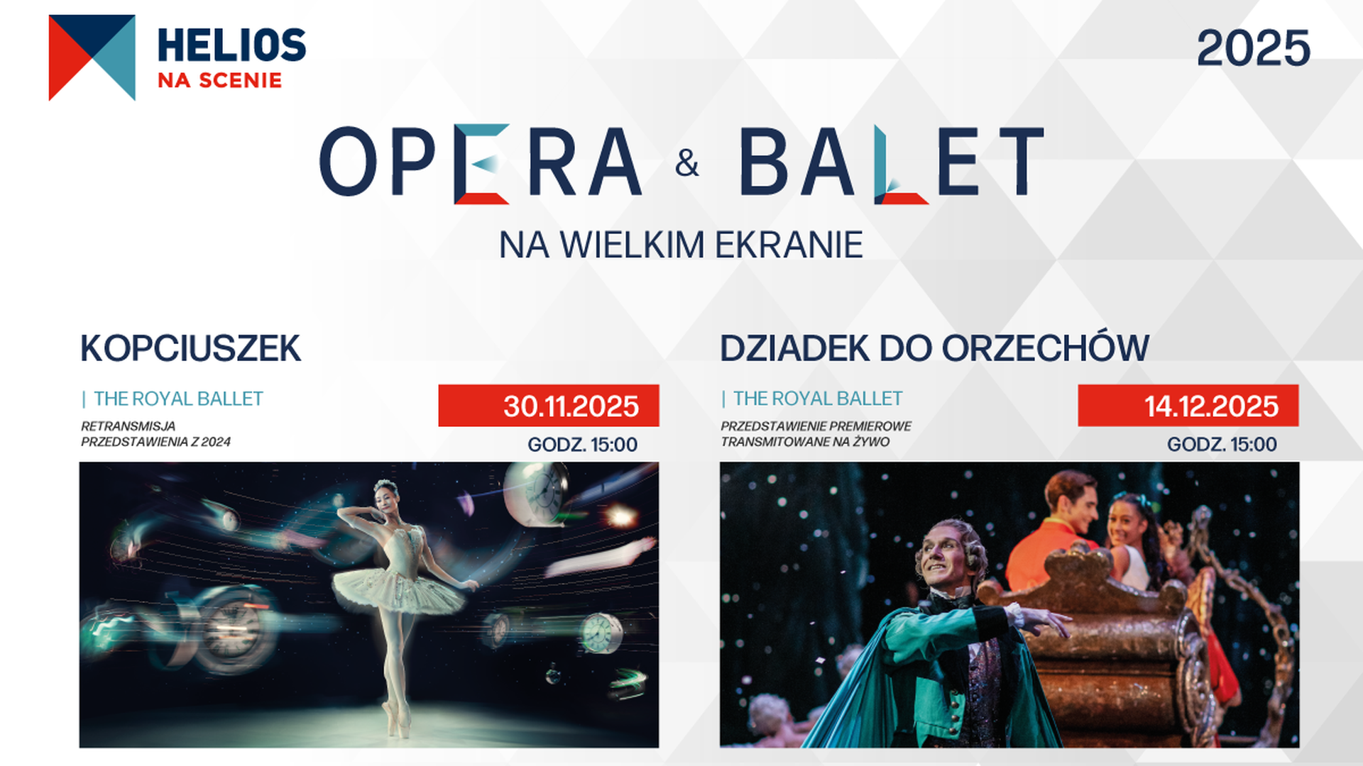 Kino Helios Krosno, serdecznie zaprasza 30 listopada o godz. 15:00 na retransmisję spektaklu ,,Kopciuszek'' oraz 14 grudnia o godz. 15:00 na transmisję ,,Dziadka do orzechów'' w ramach cyklu Helios na Scenie. Uwięziona w domu i zmuszana do pracy przez swoje rozpieszczone przyrodnie siostry, Kopciuszek wiedzie ponure i monotonne życie. Wszystko zmienia się, gdy pomaga tajemniczej kobiecie... Dzięki odrobinie magii zostaje przeniesiona do niezwykłego świata – miejsca, w którym wróżki obdarowują darami pór roku, dynie zamieniają się w karety, a prawdziwa miłość czeka tuż za rogiem. Ten czarujący balet, stworzony przez założyciela The Royal Ballet – Fredericka Ashtona, to teatralne widowisko dla całej rodziny, które przenosi widzów do bajkowej krainy, gdzie odrobina magicznego pyłu sprawia, że marzenia się spełniają. Spektakl został nagrany na żywo w Royal Opera House w Londynie w grudniu 2024 roku. Dziadek do orzechów w choreografii Petera Wrighta zachwyca publiczność od swojej premiery w 1984 roku. Zawiera najbardziej znane melodie Czajkowskiego i ożywa dzięki wykwintnym projektom scenograficznym Julii Trevelyan Oman. To prawdziwie świąteczne widowisko, które oczaruje widzów w każdym wieku. Magik Herr Drosselmeyer musi uratować swojego siostrzeńca. Hans-Peter został przemieniony w Dziadka do orzechów; jedynym sposobem, by go ocalić, jest pokonanie przez Dziadka do orzechów Króla Myszy oraz znalezienie dziewczyny, która go pokocha i się nim zaopiekuje. Iskra nadziei pojawia się w osobie młodej Clary, którą Drosselmeyer spotyka na świątecznym przyjęciu. Dzięki odrobinie magii przytulne bożonarodzeniowe spotkanie przemienia się w cudowną przygodę.