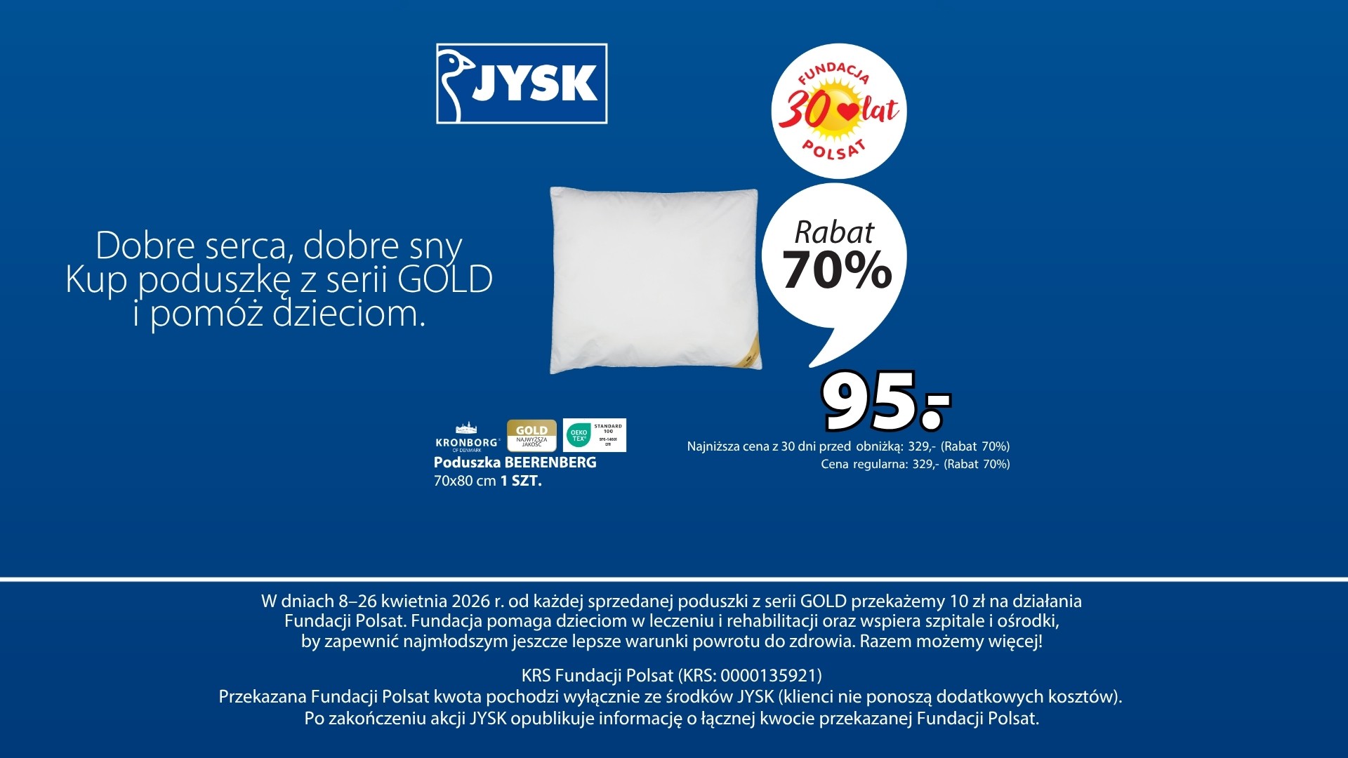 Dobre serca, dobre sny w JYSK! Kup poduszkę z serii GOLD i pomóż dzieciom. W dniach 8-26.04 od każdej sprzedanej poduszki z serii GOLD przekażemy 10 zł na działania Fundacji Polsat.