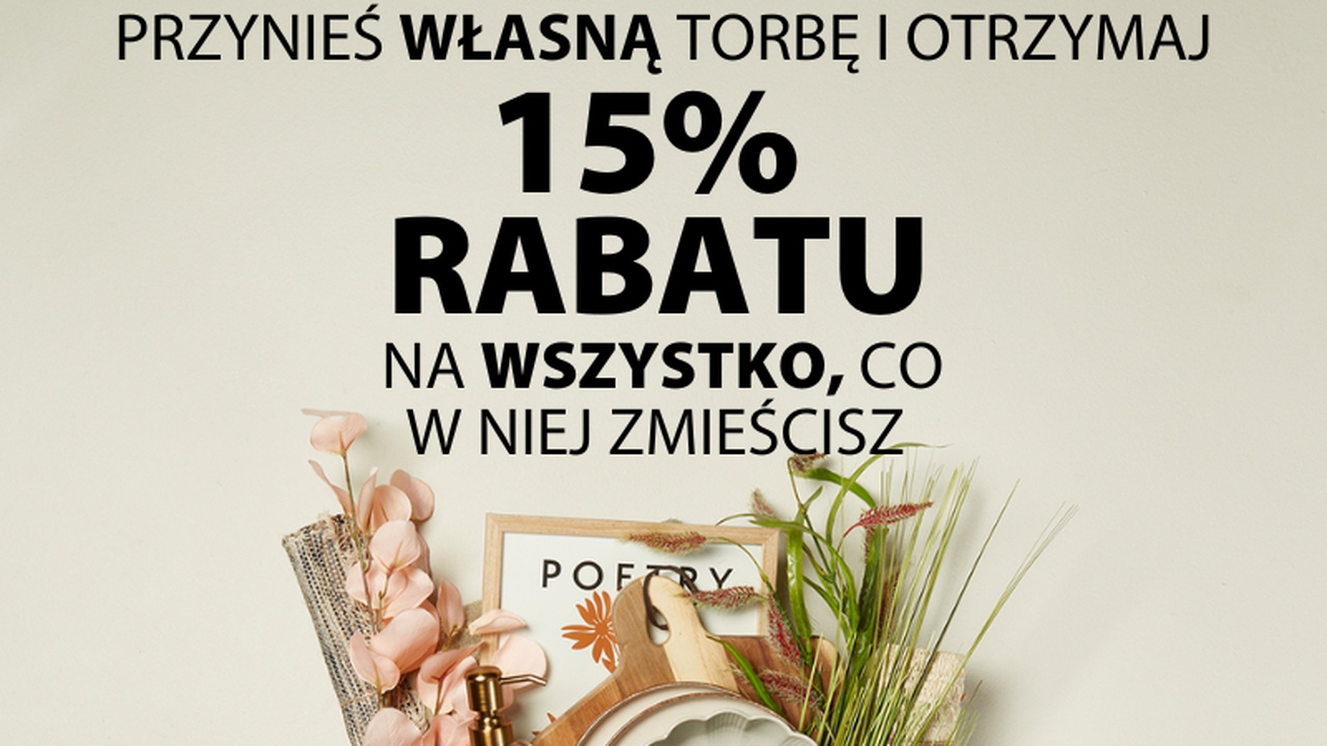 Przynieś własną torbę do JYSK i otrzymaj 15% rabatu na wszystko, co w niej zmieścisz. Rabat dotyczy również artykułów w obniżonej cenie. Promocja jest ważna w dniach 18-24.02.2026.