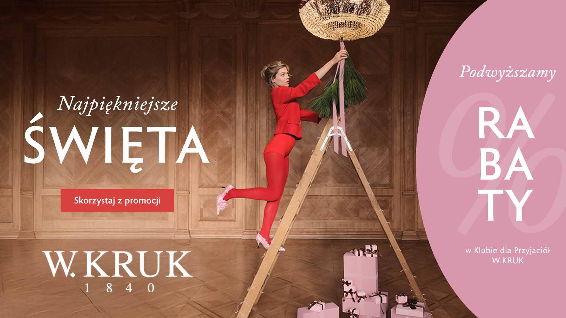Promocja obowiązuje od 3.11.2025 do 24.12.2025. Skierowana jest do obecnych i nowych Członków Klubu dla Przyjaciół W.KRUK. Szczegóły oraz wykluczenia dostępne są w regulaminie promocji i regulaminie Klubu dla Przyjaciół W.KRUK na wkruk.pl lub w salonach. Rabat naliczany jest od cen regularnych.