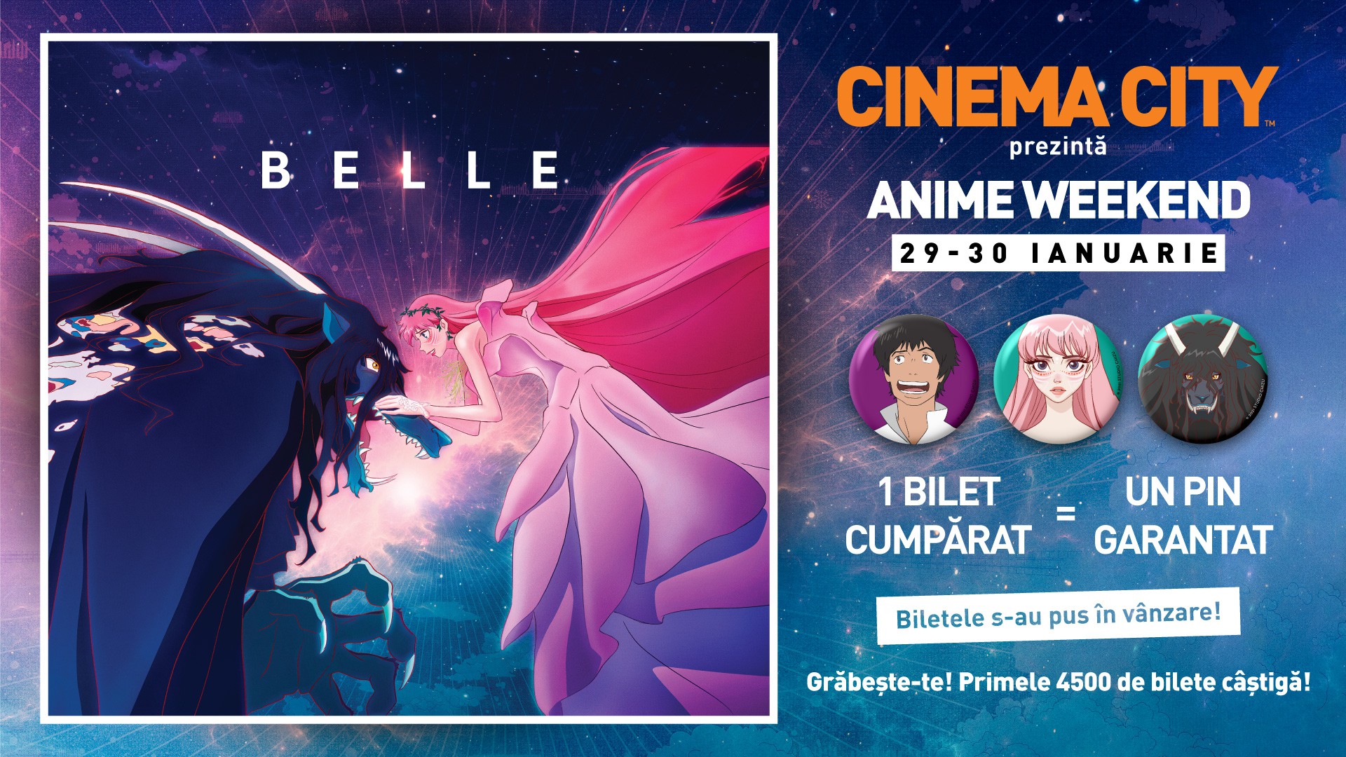 Primul anime din cinematografele românești este la Cinema City, în VIVO! Mega producția BELLE te așteaptă weekendul 29-30 ianuarie la Cinema City. Primele 4500 bilete puse la vânzare îți aduc o dublă surpriză: poți câștiga un pin cu personajul tău preferat și un premiu super cool!