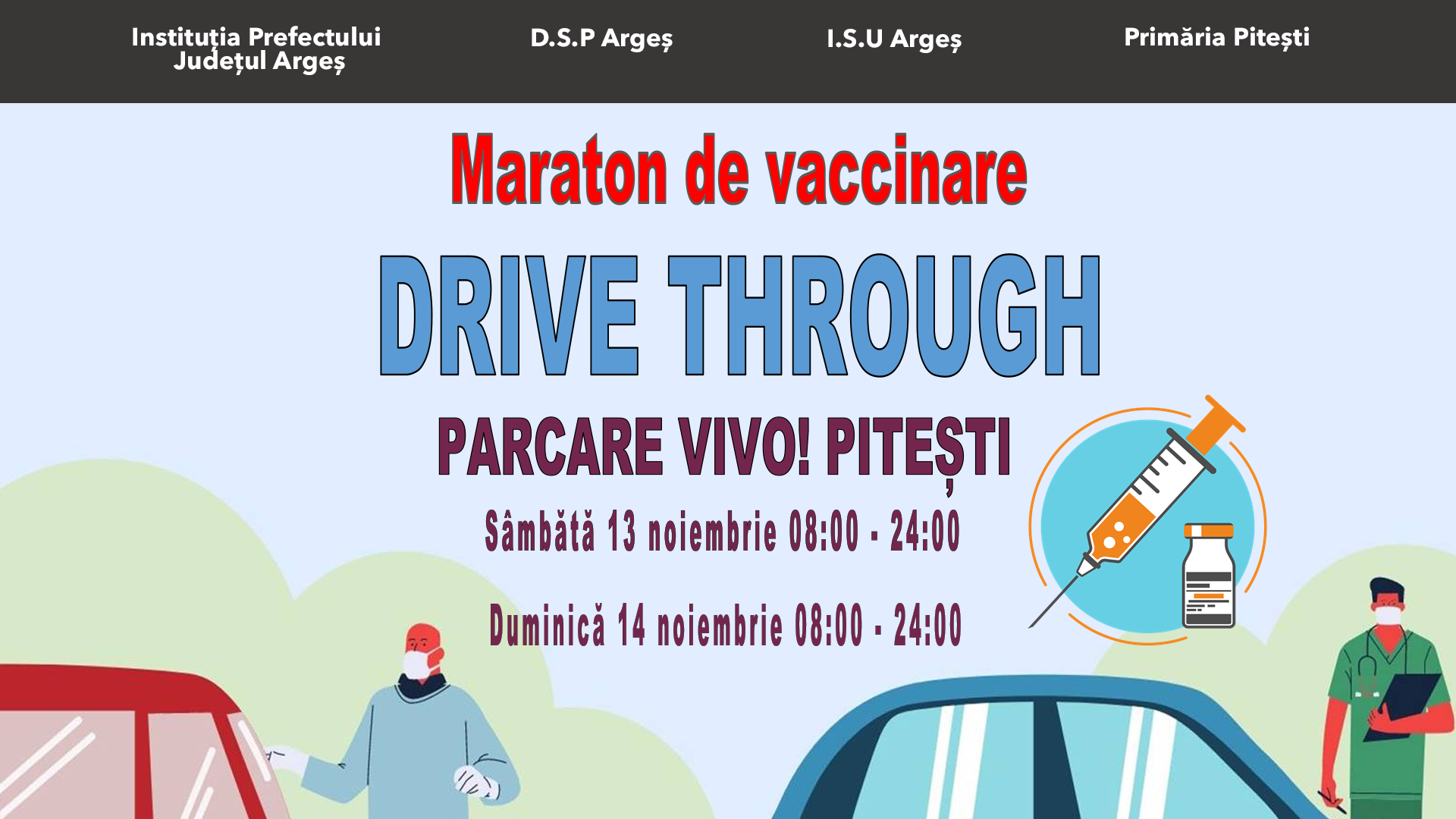 Sâmbătă și duminică, 13 și 14 noiembrie, în parcarea VIVO! Pitești, are loc primul maraton drive through de vaccinare organizat în județul Argeș de către Prefectura Argeș, D.S.P. Arges, I.SU. Arges și Primăria Pitești.